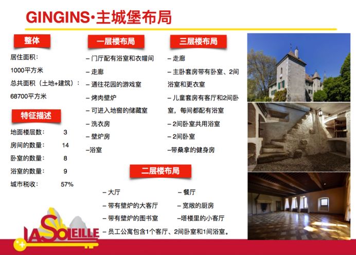 (4)GINGINS城堡的公开定价在3500万瑞士法郎,可通过瑞士雷梭勒家族办公室服务得到优惠价,获得低于3000万瑞郎成交价(可在2600~2900万瑞郎洽谈空间)。GINGINS城堡的城市税是57%,根据税收协议,州税和城市税收需与州税务局进行协商。