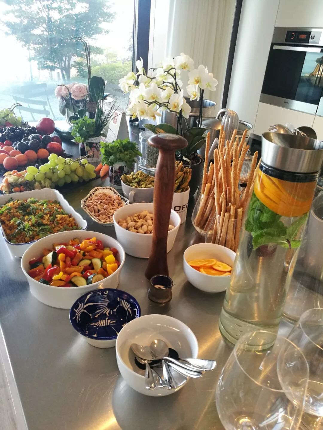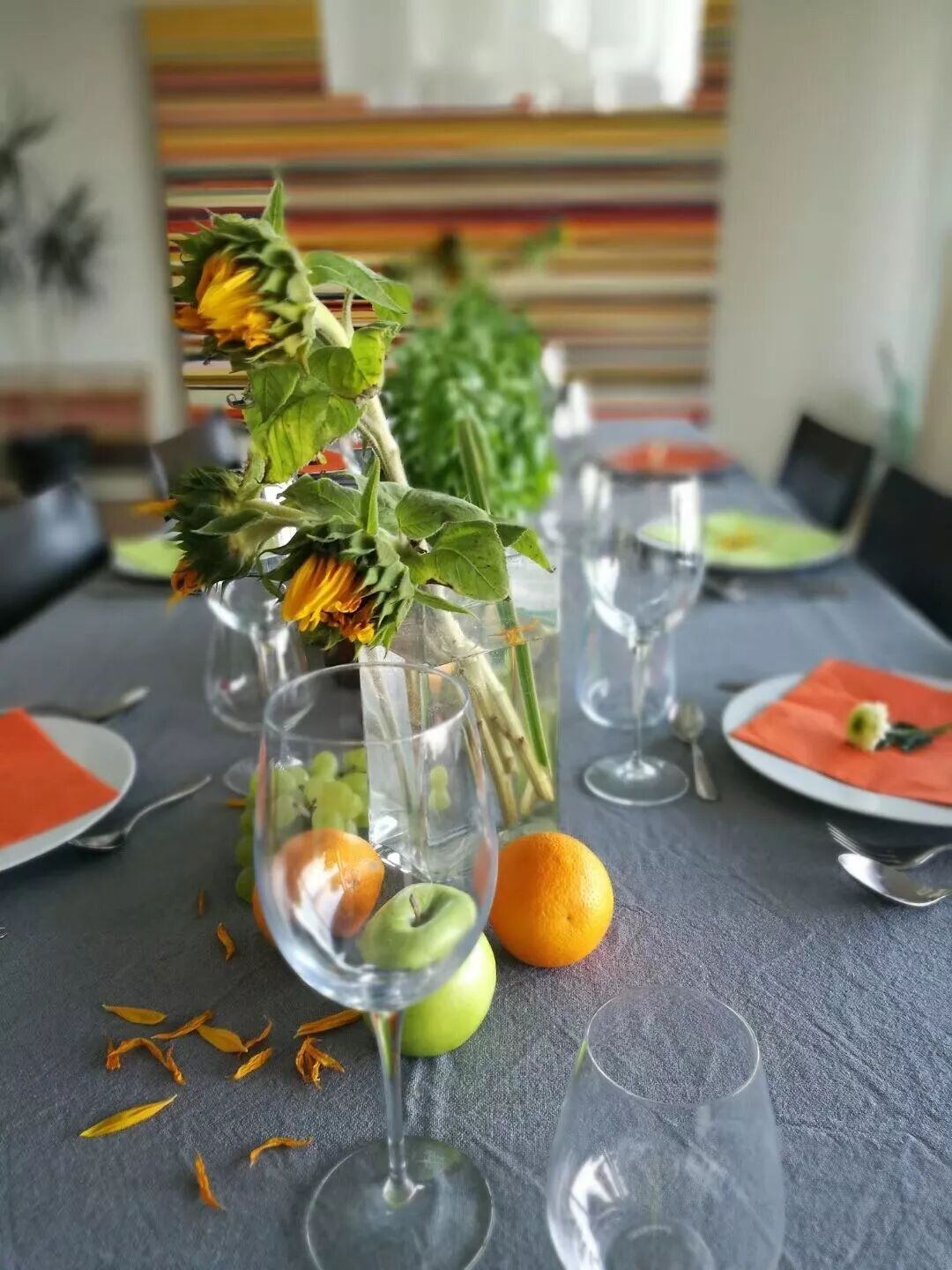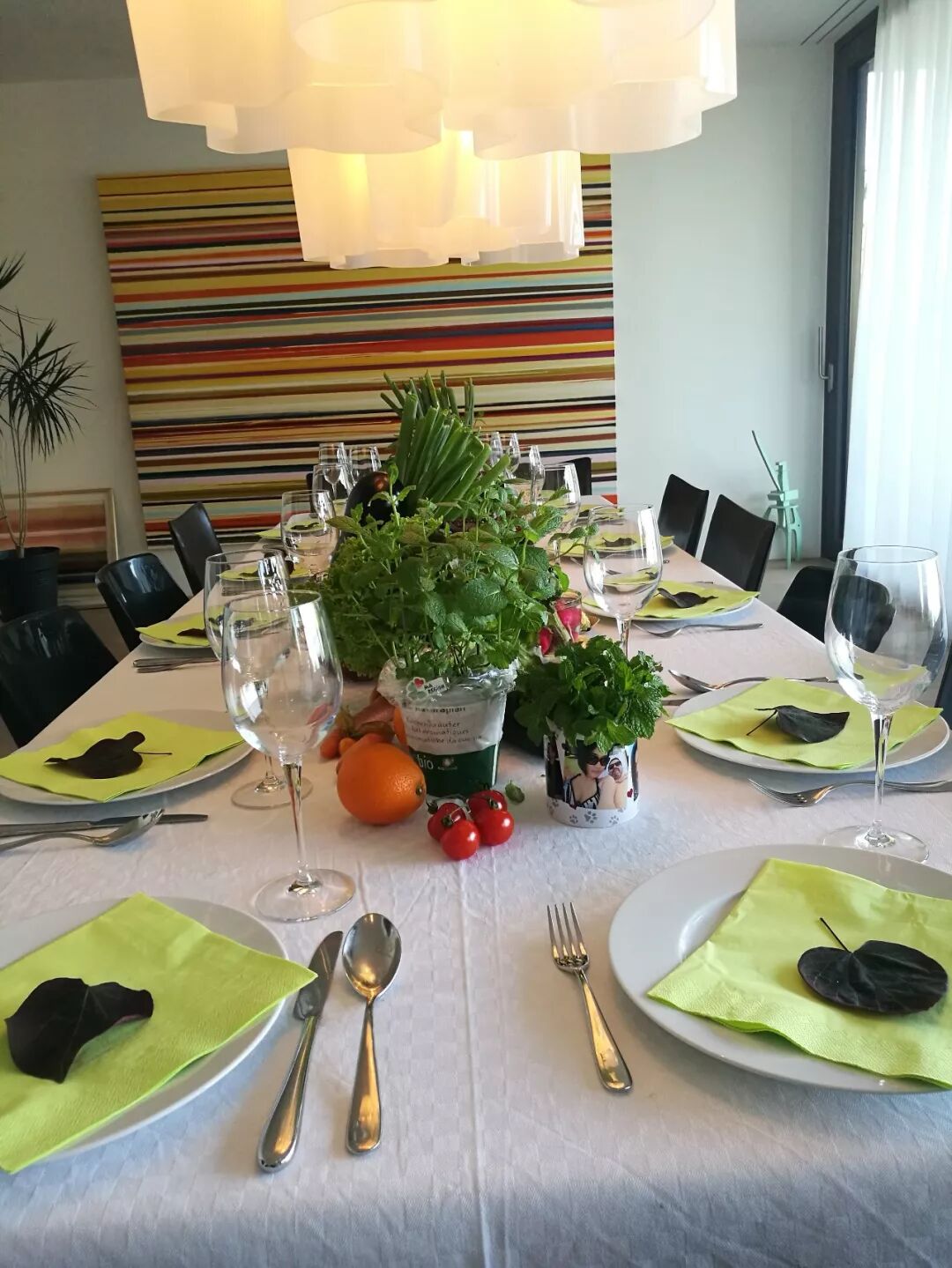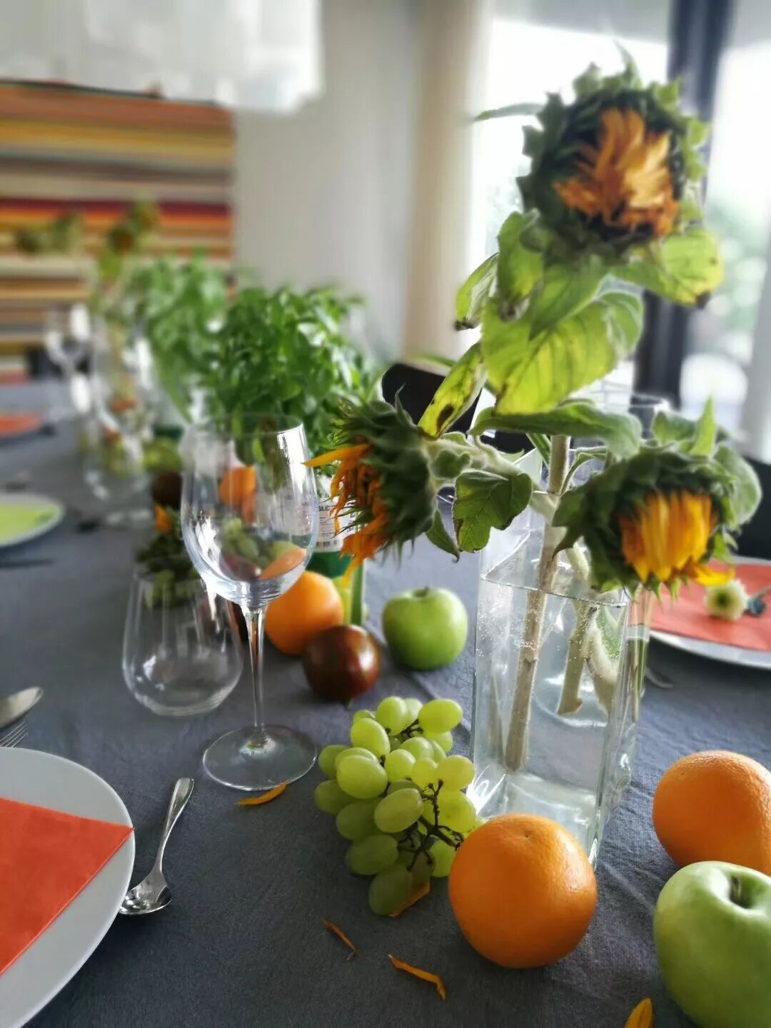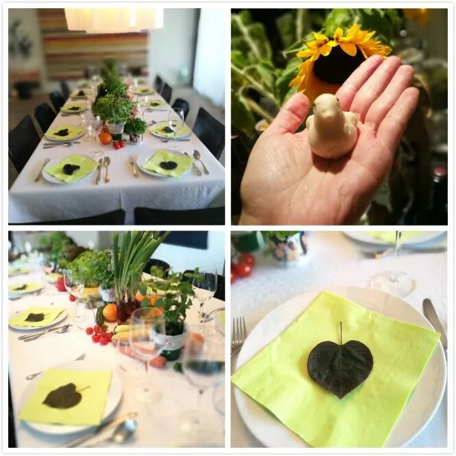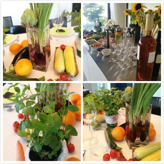 在瑞士请客吃饭,餐桌装饰是一门艺术,既体现了主人的热情好客又表达了对客人到访的欢迎。晚餐主题为“盛夏的果实”,精致的餐具餐盘,雅致的插花,金黄的向日葵, 餐前酒是纳沙泰尔朋友酒庄里的一款Rose,当季的各类水果蔬菜。餐盘上精心摆放着跟家宴主色调相称的青绿色纸巾和精心装点的一片绿叶。烘托出了舒适,温馨,自然的格调。