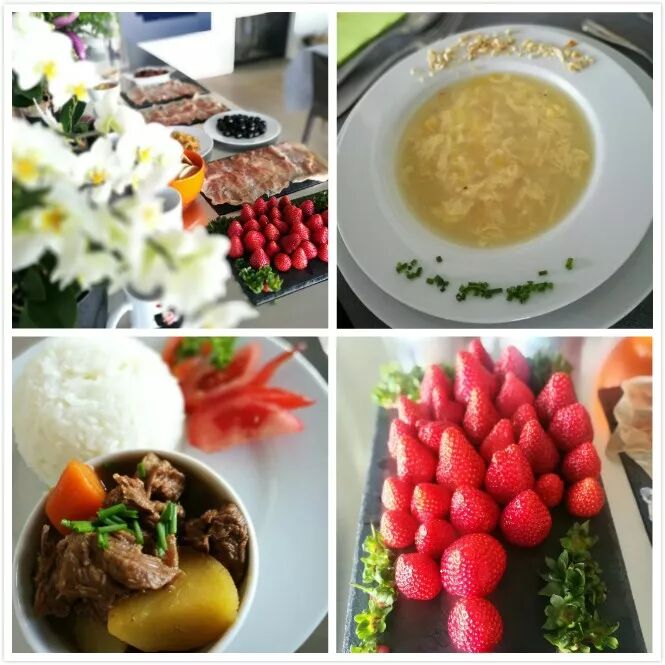 头菜为纳沙泰尔的当地特产,果味非常浓郁的鲜红草莓搭配瑞士火腿肉,当然在这样子的家宴里,自是少不了纳沙泰尔朋友酒庄里的另外两款酒。菜肴还有新鲜玉米浓汤,入味的炖牛肉,喷香的蒸米饭。中国的客户已经在瑞士停留了一周,对吃到可口的中餐表示十分感动。