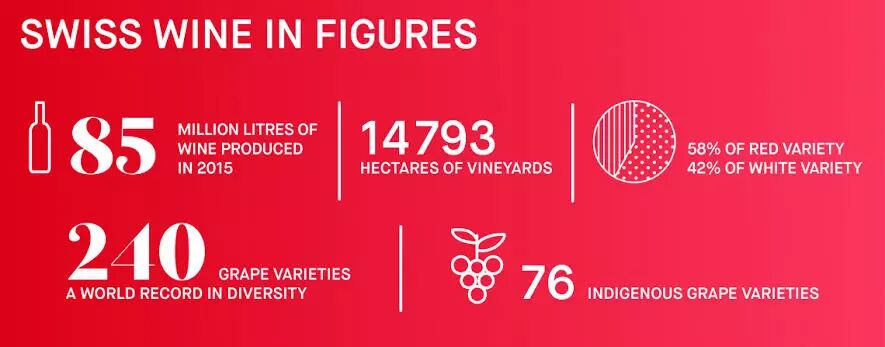瑞士现今仅有约40000英亩(15000公顷)葡萄园,每年能产出约8500万升商用葡萄酒,但这仅能满足本国需求的40%。因此,长期以来,珍贵且稀有的瑞士葡萄酒极少出口,酒庄的好酒很早就被当地人抢购预定了,连瑞士本国市场都来不及流入,国外人一睹芳容的机会便少之又少,想从世界名酒殿堂名录中寻觅瑞士酒更是难上加难。