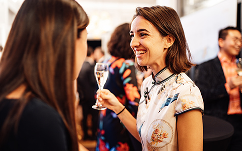 热烈的问候,温暖的拥抱,大堂的氛围因宾客的到来变得越加灵动忙碌起来。有人举杯同庆,有人把酒言欢。身着燕尾服的侍者,优雅的为客人们斟满柔美醇香的白葡萄酒,如鱼得水,手举的托盘不一会儿就一扫而空。