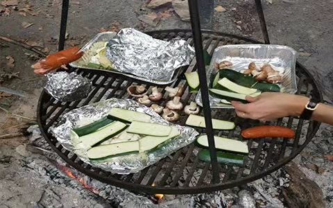 当我们把一包包香肠和土豆放在余烬中间,并用铲子将它们埋好后,又往火里添加了更多的干柴,以生成更多的新的余烬。乡下的大多数篝火烧烤通常都配有一个烤架,方便你烹调肉、鱼和蔬菜。我们使用了烤架来烹饪蔬菜,以保持食材的温度。