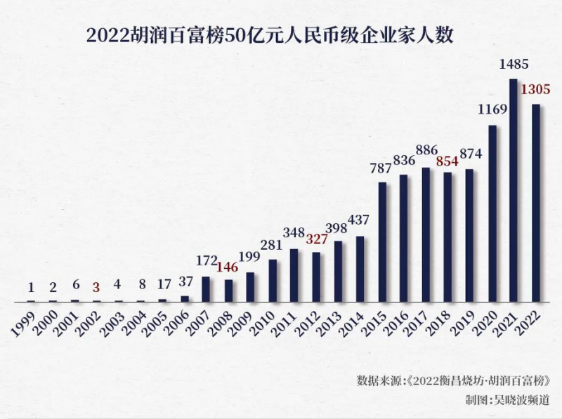 整体而言,中国过去的一年是艰难的。2022年的胡润百富榜单里,上榜企业家人数和财富双双下滑。共有1305位个人财富50亿元人民币以上的企业家上榜,比去年减少11%(共计160人);上榜企业家总财富比去年下降18%。其中,只有411位企业家财富比去年增长,1187位企业家财富比去年缩水或保持不变,293位今年落榜。今年财富数额增长最多的前十名企业家一共增长了3000多亿,仅为去年的26%。