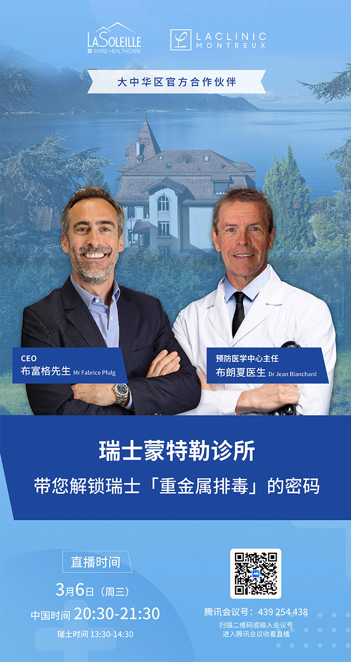 3月6日(周三)中国时间晚上20:30,瑞士蒙特勒诊所的CEO布富格先生(Mr Fabrice Pfulg)和预防医学中心主任布朗夏医生(Dr Jean Blanchard)将做客雷梭勒直播间,为您讲解瑞士重金属排毒疗程的优势、科普抗衰老药物的原理、分享瑞士抗衰老药物的独到之处,欢迎到时上线收看。
