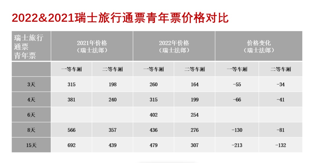 瑞士交通系统针对不同游客的需求提供多种票证的选择。2022年,在原有票证的基础上,更有新票证及新价格的上线。例如瑞士旅行通票(连续和活期)在3天,4天,8天和15天通票的基础上新增了6天通票。8天和15天的通票进行了价格调整,调整后比原来优惠近20%。