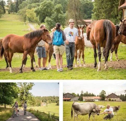 郁郁葱葱的牧场和苍翠茂密的松林构成了一幅宁静的美丽画卷,四周散布着一个个独立的农庄,奶牛和马匹自由自在地漫步,安静祥和而又充满力量。当你骑行到位于汝拉州弗莱贝根的La Bosse,这座位于海拔约1000米的高原上的小村庄的时候,脑子里是想不出一个完美的形容词的。因为这太美而忘记骑行,倒是真的有可能~ 这个地区以培养弗莱贝格品种的马而闻名。在当地经营有机农场Sous la Neuvevie的Thierry就延续着从祖父和父亲那里的重要传统——饲养弗莱贝戈马,确保这种濒临灭绝的品种不会消失。用他的话来说就是:“重视动物福利,尊重自然”。